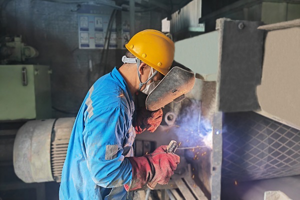 坐標(biāo)烏茲別克斯坦,卡爾希海螺的技改工作正在有序進(jìn)行中,這是水泥磨磨頭密封改造現(xiàn)場,烏籍員工加發(fā)在焊接作業(yè)中的背影。(孫艷偉/攝)