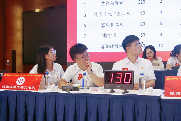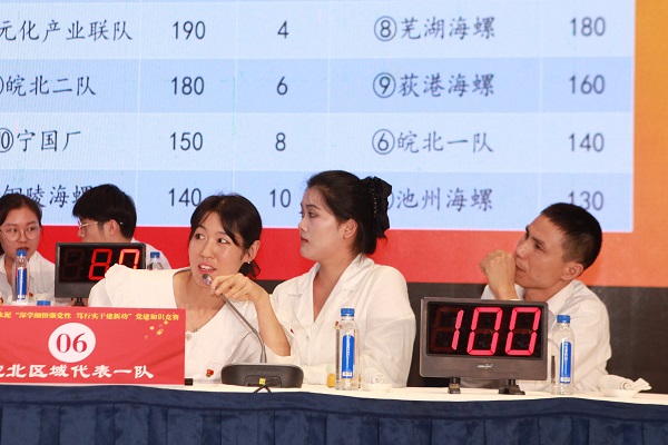 進(jìn)入審時(shí)度勢(shì)環(huán)節(jié),現(xiàn)場(chǎng)氛圍愈加緊張而激烈,這一輪考驗(yàn)著選手的綜合實(shí)力和戰(zhàn)術(shù)策略。各代表隊(duì)根據(jù)自身得分情況,自主選取40分、30分、20分三種不同分值題目作答。在這一輪,有的代表隊(duì)背水一戰(zhàn)、成功“逆襲”,有的代表隊(duì)穩(wěn)扎穩(wěn)打、保持領(lǐng)先。各隊(duì)得分此起彼伏、場(chǎng)下觀眾掌聲不斷。經(jīng)過(guò)三個(gè)環(huán)節(jié)的緊張較量,樅陽(yáng)海螺代表隊(duì)、省內(nèi)多元化產(chǎn)業(yè)聯(lián)隊(duì)、寧國(guó)廠代表隊(duì)等6支代表隊(duì)突出重圍,成功進(jìn)入第二階段的晉級(jí)賽。