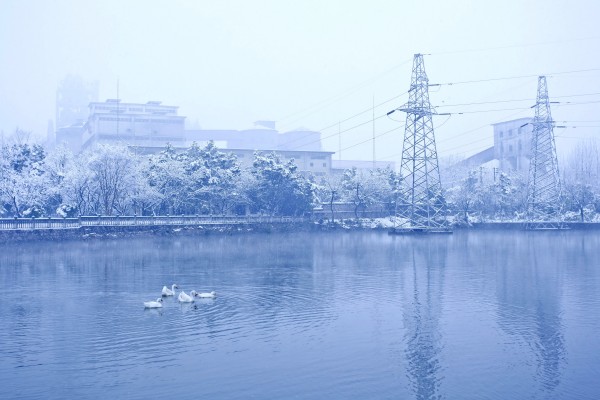 青山不老,因雪白頭。一場雪后,冬日的礦山覆上了一層冬裝,寒霧籠紗,遠處隱約空蒙,近處清明沉靜,唯有行駛的礦車打破了這份寧靜。白鵝在海螺湖上游蕩,一圈圈漣漪蕩漾開來,譜寫出一曲浪漫的冬日戀歌。山水皆靜,不由得想起明朝張岱的那篇《湖心亭看雪》:“余拏一小舟,擁毳衣爐火,獨往湖心亭看雪”。朔風寒夜,掬一捧白雪,圍爐煮茶,亦是有滋有味。