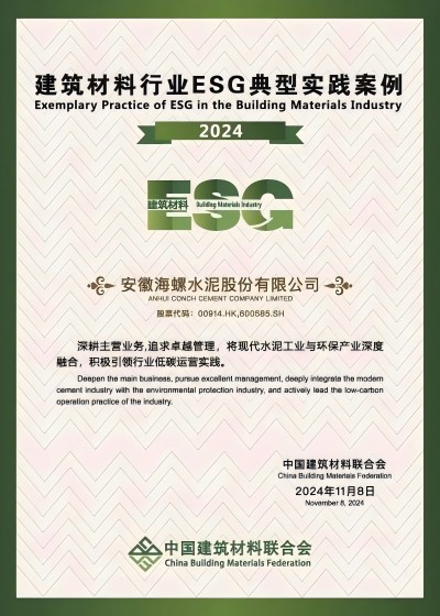 11月13至14日,中國建筑材料聯(lián)合會在北京召開2024年度建筑材料行業(yè)大會,會上發(fā)布了中國建筑材料行業(yè)ESG發(fā)展研究報告(2024)及典型案例,海螺水泥憑借在ESG方面的卓越實踐,成功入選“2024年度建筑材料行業(yè)ESG典型實踐案例”。