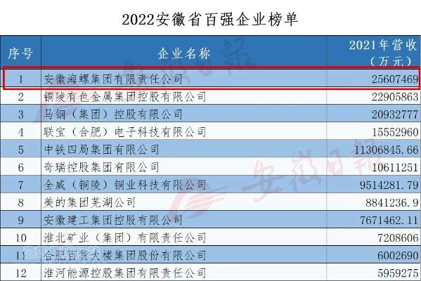 12月12日,安徽省企業(yè)聯(lián)合會、省企業(yè)家聯(lián)合會連續(xù)第18次發(fā)布“2022安徽百強企業(yè)”、“2022安徽制造業(yè)百強企業(yè)”、“2022安徽服務業(yè)百強企業(yè)”榜單。海螺集團名列“2022安徽百強企業(yè)”、“2022安徽制造業(yè)百強企業(yè)”兩項第一。