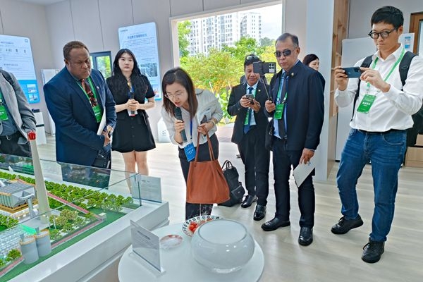 “海螺屋”中間的綠色低碳智慧水泥工廠沙盤科技感、互動(dòng)感十足,集成展現(xiàn)了水泥生產(chǎn)智能化、無人駕駛、碳捕集利用等先進(jìn)技術(shù),是近年來海螺推動(dòng)產(chǎn)業(yè)高端化、智能化、綠色化發(fā)展的一個(gè)縮影,沙盤一旁的海螺智慧農(nóng)業(yè)紅櫻桃番茄分外亮眼,吸引前來參觀的領(lǐng)導(dǎo)、外賓品嘗,傾聽海螺綠色低碳發(fā)展背后的精彩故事。