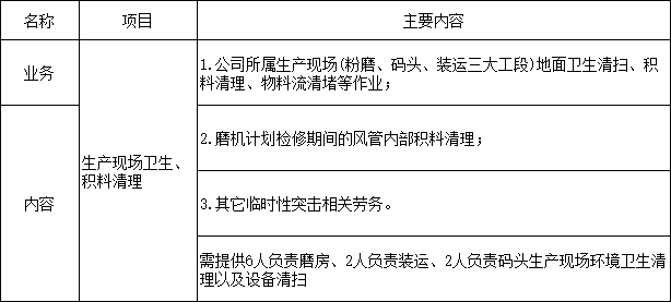 根據(jù)江門(mén)海螺水泥有限公司生產(chǎn)經(jīng)營(yíng)需求,為確保招標(biāo)人生產(chǎn)現(xiàn)場(chǎng)(粉磨、碼頭、裝運(yùn)三大工段)地面衛(wèi)生清掃、積料清理、物料流清堵等作業(yè)開(kāi)展,本著“公開(kāi)、公平、公正”的原則,選擇經(jīng)營(yíng)能力較好、經(jīng)營(yíng)資質(zhì)合格、服務(wù)質(zhì)量較強(qiáng)的勞務(wù)公司承接招標(biāo)人勞務(wù),歡迎具備條件的單位參加,現(xiàn)將有關(guān)事項(xiàng)公示如下: