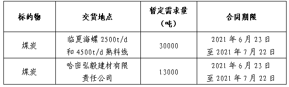 為做好臨夏海螺及哈密弘毅公司7月份煤炭采購(gòu)工作,滿足生產(chǎn)需要,本著“公開(kāi)、公平、公正”的原則,擬對(duì)煤炭供貨進(jìn)行公開(kāi)招標(biāo),現(xiàn)將招標(biāo)采購(gòu)信息發(fā)布如下: