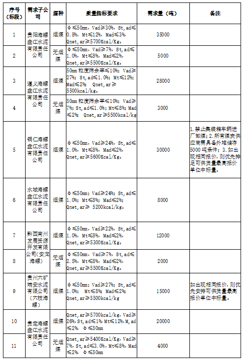海螺水泥貴州區(qū)域擬對2021年7月21日至2021年8月20日生產用煤炭進行公開招標,選定中標單位,現(xiàn)將相關招標事宜公示如下: