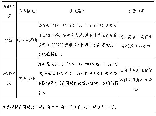 5.昆明海螺:水渣:月供貨能力不得低于3000噸;壯鄉(xiāng)公司:燃煤爐渣:月供貨能力不得低于4000噸。