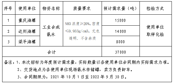 川渝區(qū)域重慶海螺、達州海螺、梁平海螺2021-2022年脫硫脫硝用氨水,具體信息如下表: