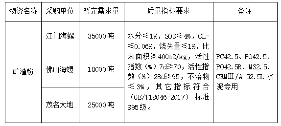 按照廣東區(qū)域供應(yīng)專業(yè)組2021年招標(biāo)計劃安排,安徽海螺水泥股份有限公司廣東區(qū)域下屬的江門海螺、佛山海螺、茂名大地三家公司擬對2021年下半年礦渣粉采購進(jìn)行聯(lián)合公開招標(biāo),為進(jìn)一步體現(xiàn)公平、公正、公開的原則,拓寬采購渠道,提高采購質(zhì)量,現(xiàn)將相關(guān)事宜公告如下: