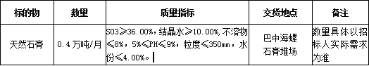 根據(jù)巴中海螺生產(chǎn)經(jīng)營(yíng)需求,現(xiàn)對(duì)天然石膏采購(gòu)業(yè)務(wù)進(jìn)行公開(kāi)招標(biāo),為體現(xiàn)公平、公正、公開(kāi)、透明的原則,現(xiàn)將招標(biāo)相關(guān)事宜公告如下: