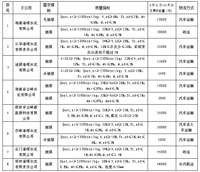 根據(jù)2021年9月21日-2021年10月20日海螺水泥湖南區(qū)域各子公司煤炭需求,現(xiàn)擬對(duì)煤炭進(jìn)行公開(kāi)招標(biāo),選定中標(biāo)人,為體現(xiàn)公平、公正、公開(kāi)的原則,拓寬采購(gòu)渠道,現(xiàn)將招標(biāo)相關(guān)事宜公告如下: