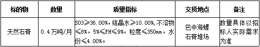 根據(jù)巴中海螺生產(chǎn)經(jīng)營需求,現(xiàn)對天然石膏采購業(yè)務(wù)進行公開招標(biāo),為體現(xiàn)公平、公正、公開、透明的原則,現(xiàn)將招標(biāo)相關(guān)事宜公告如下: