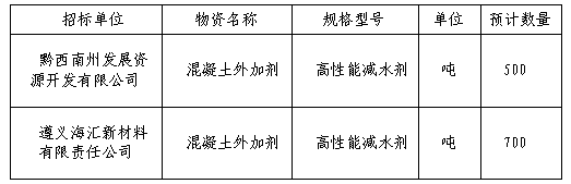 遵義海匯新材料有限責(zé)任公司與黔西南州發(fā)展資源開發(fā)有限公司擬對(duì)混凝土外加劑進(jìn)行公開招標(biāo)工作,選定供應(yīng)渠道?,F(xiàn)將相關(guān)事宜公示如下: