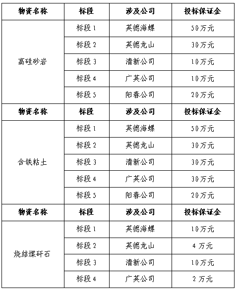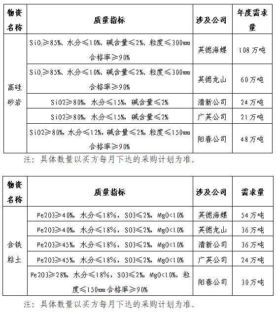 根據(jù)生產(chǎn)用料需求,擬對英德海螺、龍山、清新、廣英、陽春公司2021-2022年度高硅砂巖、含鐵粘土、燒結(jié)煤矸石進行招標(biāo),為進一步體現(xiàn)公平、公正、公開的原則,現(xiàn)將招標(biāo)采購信息發(fā)布如下: