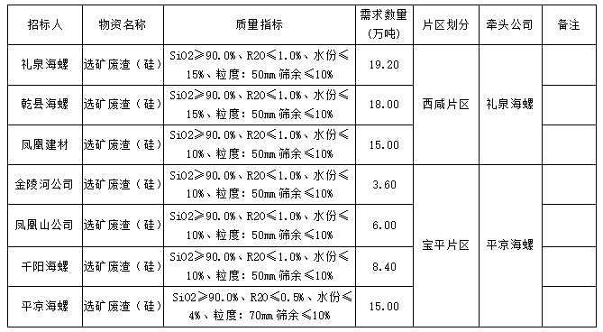 根據(jù)禮泉海螺、平?jīng)龊B荨⑶ш柡B?、乾縣海螺、金陵河公司、鳳凰山公司及鳳凰建材等7家公司生產(chǎn)經(jīng)營計劃,現(xiàn)擬對2022年生產(chǎn)用選礦廢渣(硅)采購組織招標,為進一步體現(xiàn)公平、公正、公開透明的原則,此次招標將在安徽海螺水泥股份有限公司陽光采購平臺公開進行,現(xiàn)將招標采購信息發(fā)布如下: