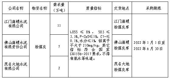 安徽海螺水泥股份有限公司廣東區(qū)域下屬的佛山、江門海螺、茂名大地三家公司擬對粉煤灰采購進(jìn)行聯(lián)合公開招標(biāo),為進(jìn)一步體現(xiàn)公平、公正、公開的原則,拓寬采購渠道,提高采購質(zhì)量,現(xiàn)將相關(guān)事宜公告如下: