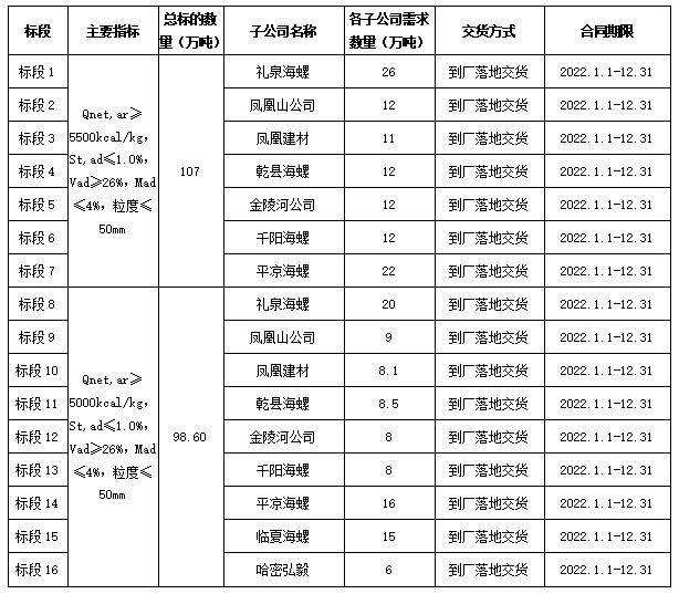 根據(jù)2022年陜甘區(qū)域各子公司煤炭需求,為保障各公司生產(chǎn),擬對(duì)2022年煤炭采購(gòu)進(jìn)行公開招標(biāo),為體現(xiàn)公平、公正、公開的原則,此次招標(biāo)將在安徽海螺水泥股份有限公司陽(yáng)光采購(gòu)平臺(tái)公開進(jìn)行,現(xiàn)將招標(biāo)相關(guān)事宜公告如下: