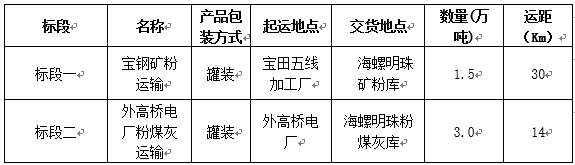 本次運(yùn)輸業(yè)務(wù)為我公司采購寶鋼散罐礦粉和外高橋電廠散罐粉煤灰的運(yùn)輸:一共分為兩個(gè)標(biāo)段:標(biāo)段一:寶鋼礦粉運(yùn)輸--依據(jù)招標(biāo)文件