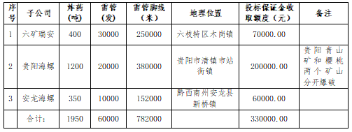 備注:六礦瑞安免費提供炸藥庫2個(核載10噸)、雷管庫1個(核載2萬發(fā))、炸藥車1輛(核載5噸),投標單位報價需綜合考慮以上情況。若中標需負責(zé)辦理炸藥庫租賃和炸藥車掛靠手續(xù),并承擔辦理所產(chǎn)生的一切費用。合同到期后負責(zé)將炸藥庫和炸藥車轉(zhuǎn)至我公司或新中標渠道,并承擔所產(chǎn)生的一切費用。