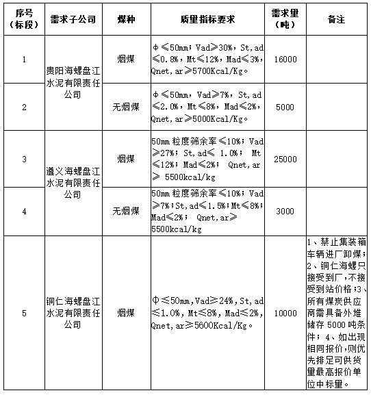 海螺水泥貴州區(qū)域擬對2021年12月21日至2022年1月20日生產(chǎn)用煤炭進(jìn)行公開招標(biāo),選定中標(biāo)單位,現(xiàn)將相關(guān)招標(biāo)事宜公示如下: