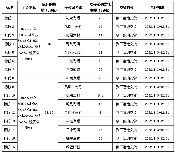 根據(jù)2022年陜甘區(qū)域各子公司煤炭需求,為保障各公司生產(chǎn),擬對2022年煤炭采購進(jìn)行公開招標(biāo),為體現(xiàn)公平、公正、公開的原則,此次招標(biāo)將在安徽海螺水泥股份有限公司陽光采購平臺公開進(jìn)行,現(xiàn)將招標(biāo)相關(guān)事宜公告如下:
