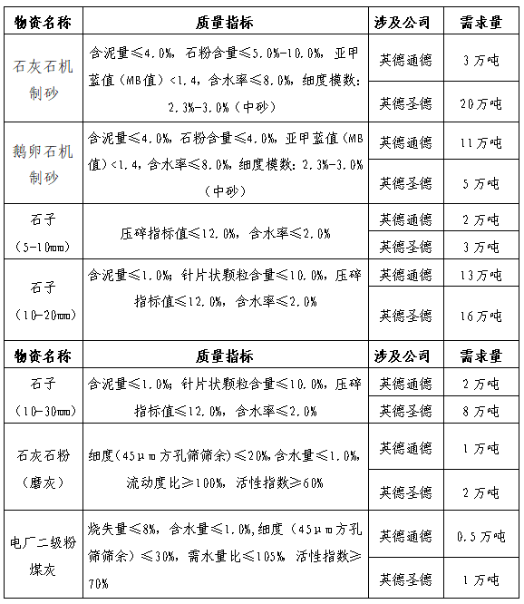 根據(jù)生產(chǎn)用料需求,擬對(duì)英德通德、英德圣德攪拌站2022年度機(jī)制砂、石子、石灰石粉(磨灰)和電廠二級(jí)粉煤灰進(jìn)行招標(biāo),為進(jìn)一步體現(xiàn)公平、公正、公開(kāi)的原則,現(xiàn)將招標(biāo)采購(gòu)信息發(fā)布如下: