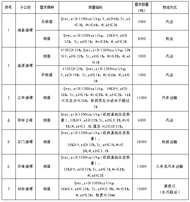根據(jù)2022年1月21日-2022年2月20日海螺水泥湖南區(qū)域各子公司煤炭需求,現(xiàn)擬對煤炭進(jìn)行公開招標(biāo),選定中標(biāo)人,為體現(xiàn)公平、公正、公開的原則,拓寬采購渠道,現(xiàn)將招標(biāo)相關(guān)事宜公告如下: