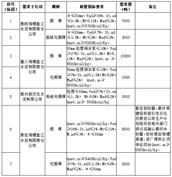 海螺水泥貴州區(qū)域擬對2022年1月21日至2022年2月20日生產(chǎn)用煤炭進行公開招標(biāo),選定中標(biāo)單位,現(xiàn)將相關(guān)招標(biāo)事宜公示如下: