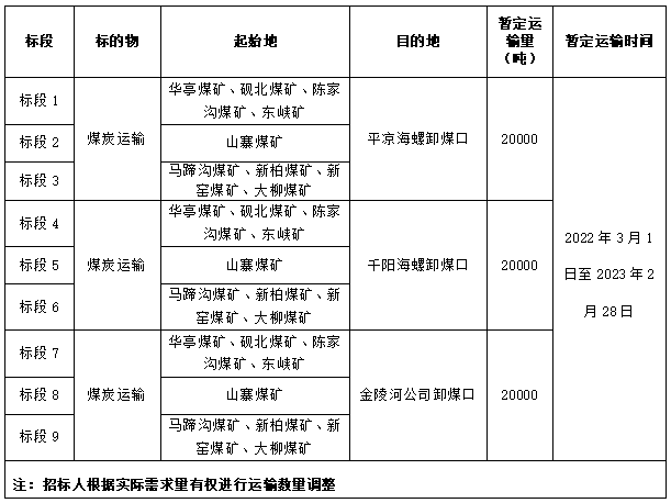 1.標(biāo)的內(nèi)容:華煤各礦點(diǎn)至平?jīng)龊B荨⑶ш柡B菁敖鹆旰庸久禾窟\(yùn)輸。