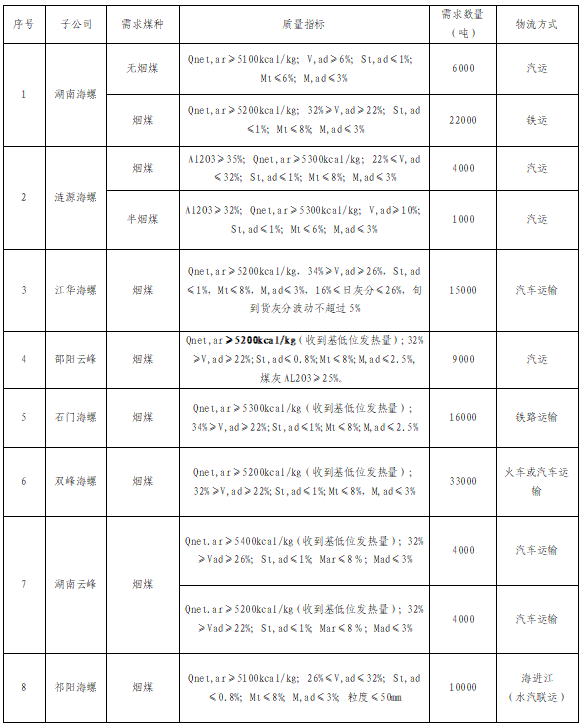 根據(jù)2022年2月21日-2022年3月20日海螺水泥湖南區(qū)域各子公司煤炭需求,現(xiàn)擬對煤炭進(jìn)行公開招標(biāo),選定中標(biāo)人,為體現(xiàn)公平、公正、公開的原則,拓寬采購渠道,現(xiàn)將招標(biāo)相關(guān)事宜公告如下:
