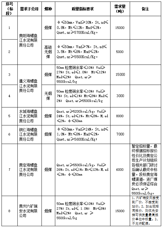 海螺水泥貴州區(qū)域擬對(duì)2022年2月21日至2022年3月20日生產(chǎn)用煤炭進(jìn)行公開招標(biāo),選定中標(biāo)單位,現(xiàn)將相關(guān)招標(biāo)事宜公示如下: