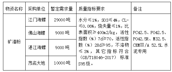 按照廣東區(qū)域供應(yīng)專業(yè)組2022年招標計劃安排,安徽海螺水泥股份有限公司廣東區(qū)域下屬的江門海螺、佛山海螺、湛江海螺、茂名大地四家公司擬對2022年2季度礦渣粉采購進行聯(lián)合公開招標,為進一步體現(xiàn)公平、公正、公開的原則,拓寬采購渠道,提高采購質(zhì)量,現(xiàn)將相關(guān)事宜公告如下: