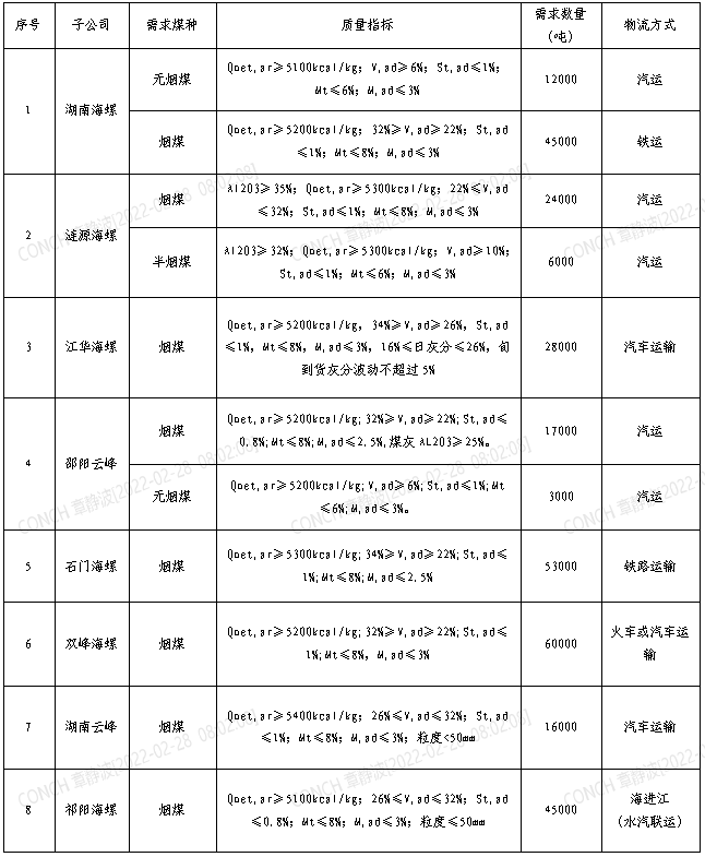 根據(jù)2022年3月21日-2022年4月20日海螺水泥湖南區(qū)域各子公司煤炭需求,現(xiàn)擬對(duì)煤炭進(jìn)行公開招標(biāo),選定中標(biāo)人,為體現(xiàn)公平、公正、公開的原則,拓寬采購(gòu)渠道,現(xiàn)將招標(biāo)相關(guān)事宜公告如下: