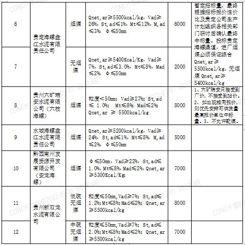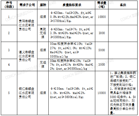 海螺水泥貴州區(qū)域擬對(duì)2022年3月21日至2022年4月20日生產(chǎn)用煤炭進(jìn)行公開招標(biāo),選定中標(biāo)單位,現(xiàn)將相關(guān)招標(biāo)事宜公示如下: