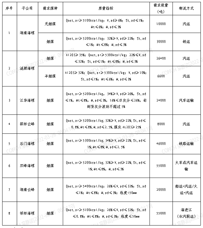 根據(jù)2022年4月21日-2022年5月20日海螺水泥湖南區(qū)域各子公司煤炭需求,現(xiàn)擬對煤炭進行公開招標,選定中標人,為體現(xiàn)公平、公正、公開的原則,拓寬采購渠道,現(xiàn)將招標相關(guān)事宜公告如下: