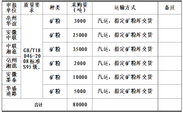 3.2022年6月至12月份礦粉計(jì)劃采購(gòu)量8萬噸,具體如下: