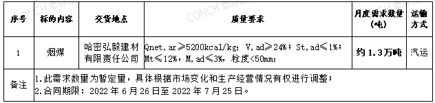 根據(jù)2022年6月份哈密弘毅建材公司煤炭需求,現(xiàn)擬對(duì)煤炭進(jìn)行招標(biāo),選定中標(biāo)人,本著公平、公正、公開的原則,拓寬采購(gòu)渠道,現(xiàn)將招標(biāo)相關(guān)事宜公告如下: