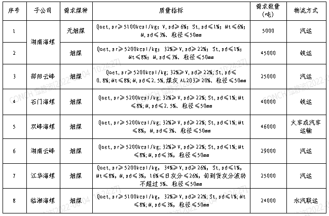 根據(jù)2022年8月21日-2022年9月20日海螺水泥湖南區(qū)域各子公司煤炭需求,現(xiàn)擬對(duì)煤炭進(jìn)行公開(kāi)招標(biāo),選定中標(biāo)人,為體現(xiàn)公平、公正、公開(kāi)的原則,拓寬采購(gòu)渠道,現(xiàn)將招標(biāo)相關(guān)事宜公告如下: