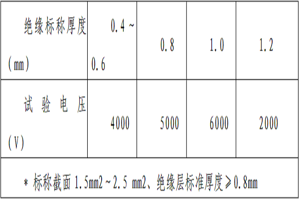 絕緣線芯應經(jīng)受下表規(guī)定的交流50Hz電壓火花試驗。(火花試驗應保證絕緣每點上經(jīng)受電壓的作用時間不少于0.2s)。