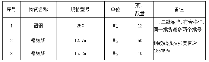 3.本次招標要求投標人公司經(jīng)營范圍需涵蓋鋼材、金屬材料、預(yù)應(yīng)力鋼絞線生產(chǎn)或銷售資質(zhì),具備獨立承擔民事責任能力。