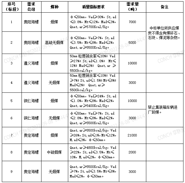 海螺水泥貴州區(qū)域擬對(duì)2022年9月21日至2022年10月20日生產(chǎn)用煤炭進(jìn)行公開(kāi)招標(biāo),選定中標(biāo)單位,現(xiàn)將相關(guān)招標(biāo)事宜公示如下: