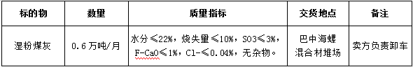 根據(jù)巴中海螺生產(chǎn)經(jīng)營需求,現(xiàn)對水泥生產(chǎn)用濕粉煤灰采購業(yè)務(wù)進(jìn)行公開招標(biāo),為體現(xiàn)公平、公正、公開、透明的原則,現(xiàn)將招標(biāo)相關(guān)事宜公告如下: