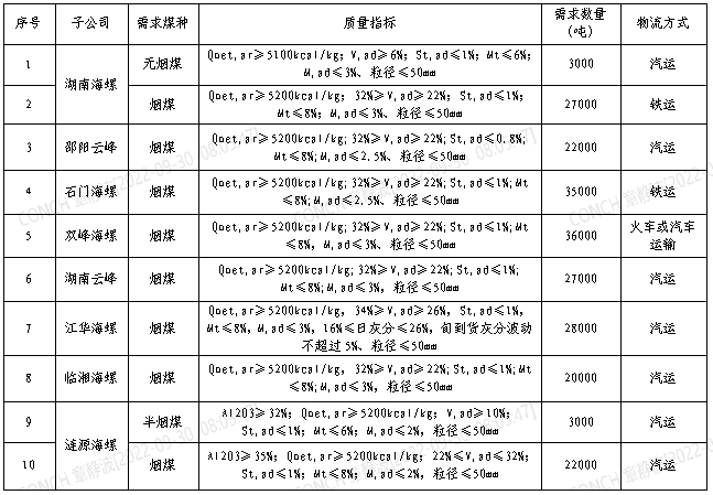 根據(jù)2022年10月21日-2022年11月20日海螺水泥湖南區(qū)域各子公司煤炭需求,現(xiàn)擬對(duì)煤炭進(jìn)行公開招標(biāo),選定中標(biāo)人,為體現(xiàn)公平、公正、公開的原則,拓寬采購(gòu)渠道,現(xiàn)將招標(biāo)相關(guān)事宜公告如下: