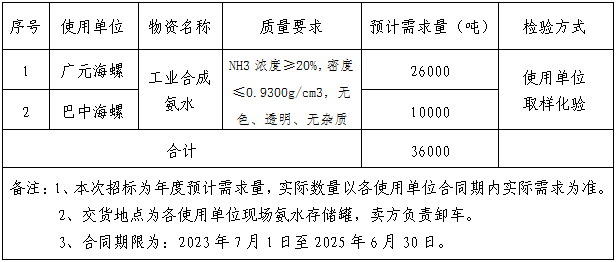 根據生產經營計劃,擬開展廣元海螺、巴中海螺2023-2025年度生產脫硝用氨水進行公開聯(lián)合招標,為進一步體現公開、公平、公正、擇優(yōu)的原則,拓寬采購渠道,保證采購質量,現面向社會對本次氨水招標進行公示,歡迎具備條件的單位參加,現將招標采購信息發(fā)布如下: