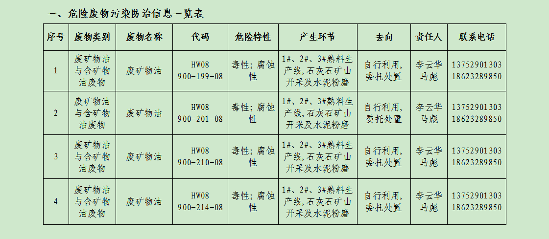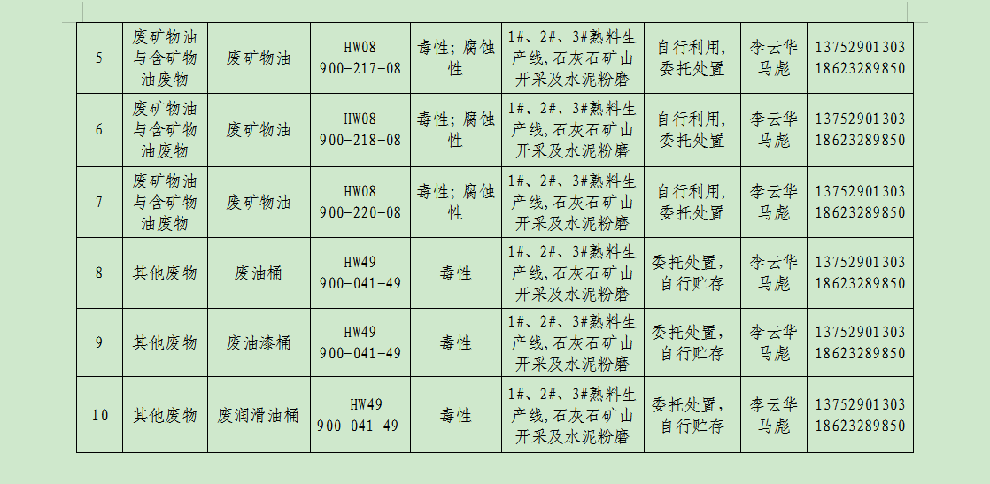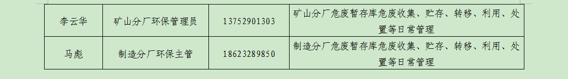 廢棄物的產(chǎn)生單位及管理:礦山分廠由俸云龍負(fù)責(zé)管理,負(fù)責(zé)督促員工把產(chǎn)生的危廢分類定期送危廢庫暫存,危廢庫由維修工段工段長負(fù)責(zé),負(fù)責(zé)收集并記錄危廢臺賬;主廠區(qū)由易軍負(fù)責(zé)管理,負(fù)責(zé)督促員工把產(chǎn)生的廢分類定期送危廢庫暫存,危廢庫由環(huán)保主管馬彪負(fù)責(zé),負(fù)責(zé)收集并記錄危廢臺賬。危廢庫危廢定期聯(lián)系重慶海創(chuàng)環(huán)??萍加邢挢?zé)任公司、重慶云青環(huán)??萍加邢薰?/span>等有資質(zhì)公司回收處理并完善相應(yīng)危廢聯(lián)單。