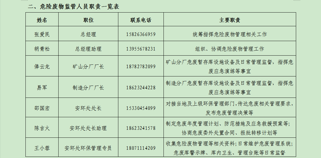 6.三大分廠負(fù)責(zé)危險(xiǎn)廢物的集中、收集、轉(zhuǎn)貯、防止損失加重。安全環(huán)保處與政府相關(guān)安全、環(huán)保、衛(wèi)生等部門協(xié)助協(xié)調(diào)。
