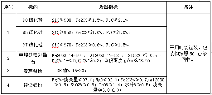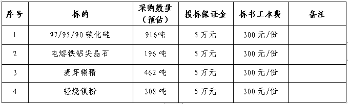 根據本公司2023年3-4季度耐火磚產品生產計劃,結合前期招標報名情況,為確保生產所需原料及時采購進廠。現對碳化硅、電熔鐵鋁尖晶石、麥芽糊精、輕燒鎂粉等原材料,本著“公開、公平、公正、透明”的原則再次公開招標,誠邀經營資質能力較好、保供和服務能力較強的生產型企業(yè)參加投標?,F就招標相關事項請示如下:
