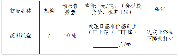 2、對于本次廢紙盒投標價格采用卓創(chuàng)資訊網(https://index.sci99.com)廢紙價格指數報價,出售價格為出售當日(以車輛重車過磅時間為準)卓創(chuàng)資訊網廢紙價格指數±xx元/噸。若處理當日指數停發(fā),以停發(fā)前一日發(fā)布的指數為準。