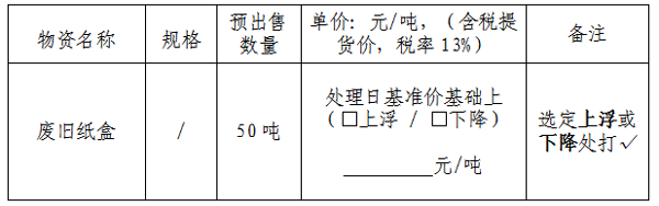 2、對于本次廢紙盒投標(biāo)價格采用卓創(chuàng)資訊網(wǎng)(https://index.sci99.com)廢紙價格指數(shù)報價,出售價格為出售當(dāng)日(以車輛重車過磅時間為準(zhǔn))卓創(chuàng)資訊網(wǎng)廢紙價格指數(shù)±xx元/噸。若處理當(dāng)日指數(shù)停發(fā),以停發(fā)前一日發(fā)布的指數(shù)為準(zhǔn)。