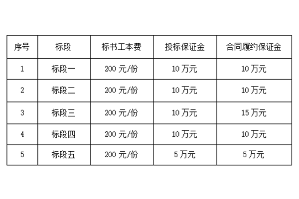每個標(biāo)段收取標(biāo)書工本費(fèi)、投標(biāo)保證金及合同履約保證金如下: