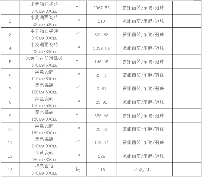 1.標(biāo)的內(nèi)容:瓷磚,具體名稱、規(guī)格及數(shù)量等以招標(biāo)文件清單約定為準(zhǔn),產(chǎn)品質(zhì)量需達(dá)到投標(biāo)品牌對應(yīng)質(zhì)保要求,施工結(jié)束有剩余,若包裝完好不影響二次銷售的需接受退貨。
